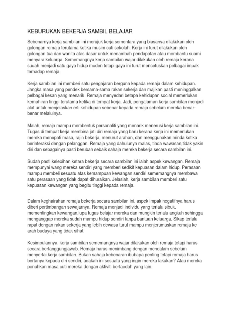 Mengelakkan diri daripada mengunjungi tempat yang kotor dan tidak bersih - tempat pembuangan sampah. Contoh Karangan SPM - Kebaikan dan keburukan belajar sambil bekerja. Mutakhir ini kita sering melihat pekerja yang bekerja di pasar raya khususnya pelajar sekolah.