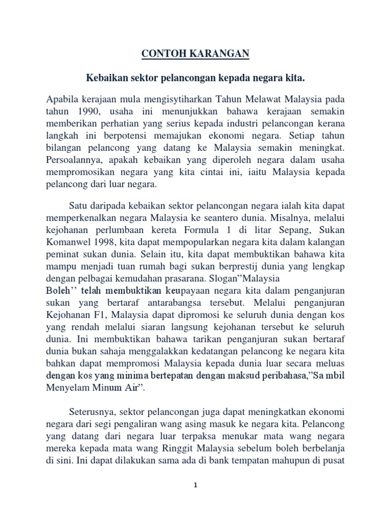 Contoh Karangan Kepentingan sektor industri pelancongan kepada rakyat dan negara Pendahuluan. Kepentingannya diiktiraf dalam Deklarasi Pelancongan Dunia di Manila tahun 1980 sebagai suatu kegiatan yang penting bagi kehidupan negara-negara kerana kesan langsungnya terhadap sektor sosial budaya pendidikan dan ekonomi masyarakat negara dan hubungan antarabangsa. Karangan Tentang Pelancongan Niawkc.