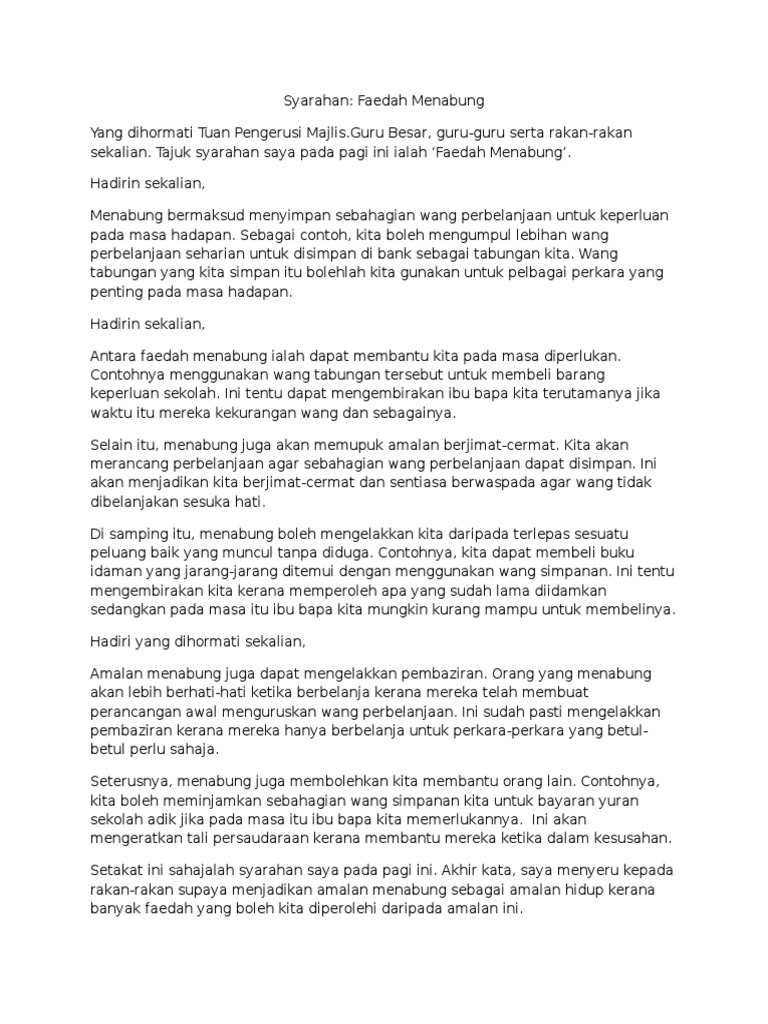 Oleh sebab itu kita perlu merancang segala perbelanjaan harian. Antara kebaikan menabung ialah kita dapat mengamalkan sikap berjimat-cermat. Karangan Jenis Dialog.