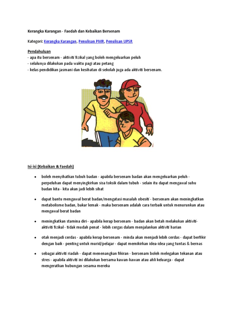 Namun begitu anda boleh menambah idea-idea yang lebih menarik serta huraian yang tepat dalam memantapkan penulisan karangan masing-masing. Anak-anak tidak akan rasa dipinggirkan. Antara faedah-faedah bersenam ialah kita dapat mencergaskan tubuh badan kitaKita akan berasa lebih cergas dan sihat semasa kita bersenamKita juga boleh mengeluarkan peluh apabila kita berjoging atau berjalan kakiBersenam juga dapat melawan penyakit-penyakit yang berbahaya seperti obesiti dan sakit jantung.